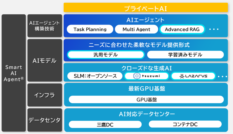 このような状況を受け、NTT DATAでは、自社のデータセンター、インフラ、AIモデル、AIエージェント構築技術など、インフラからアプリケーションのフルスタックレイヤーで、企業がコントロールできるAI環境を提供しています。企業がコントロールできるAI環境、つまりプライベートAI環境には、以下のようなAIモデルとそれを動かすAI基盤が必要です。