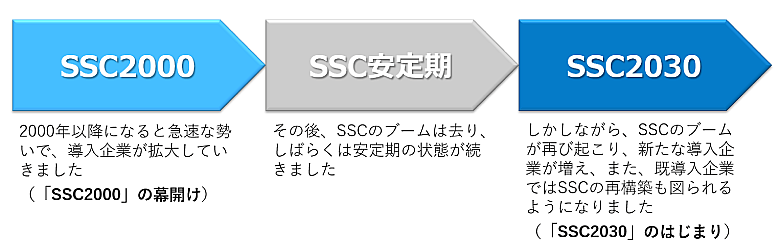 あらためて、SSCの歴史を振り返ってみたい。日本企業でSSCが初めて導入されたのは1990年代初頭。それ以降、SSCの歴史は「SSC2000」「SSC安定期」「SSC2030」で整理することができる。