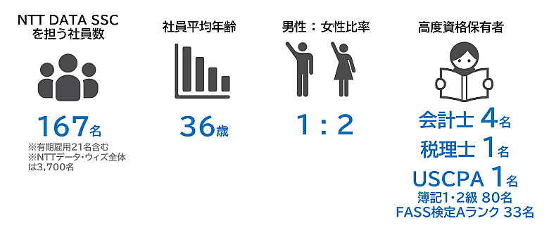 現在では、連結決算の財務数値に関する報告、税務監査、監査時の情報提供、会計制度の変更対応など、通常であれば本社の財務経理部門が担うような、高度かつ戦略的な業務も受託。断続的に実施しているM&Aや企業再編といった経営戦略実行を下支えしている。NTT DATAのSSC業務移管のノウハウを生かし、顧客企業の業務可視化・標準化のコンサルティングや、経理DX支援、BPOと外販事業にも注力をしている。社員構成は167名。平均年齢は36歳と、グループ平均年齢よりも若い水準だ。公認会計士や税理士、USCPA(米国公認会計士)といった高度資格保有者も多く在籍する。