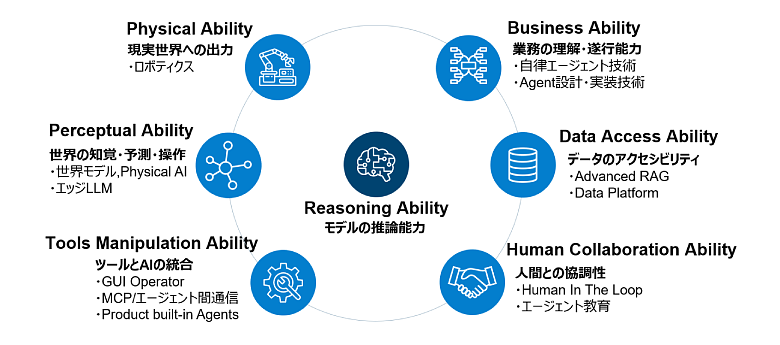 2024年10月に当社では、AIエージェントが自律的に対象業務のタスクを抽出・整理・実行する生成AI活用コンセプト「Smart AI Agent」を発表しました。Smart AI Agentでは、AIエージェントに求められる能力として7つの能力を定義しています。中心となるモデルの推論能力は基礎的な生成AIモデルの能力であり周辺の能力を支えます。業務の理解・遂行能力は、業務の目的や内容を自律的にタスクを実行する能力です。その際に必要な情報に素早くアクセスし活用するためのデータのアクセシビリティが必要です。また、人と連携しながら作業を進めるための人間との協調性、そして既存の業務ツールと連携するためツールとAIの統合が必要になります。その他、現実世界とやりとりする業務では世界の知覚・予測・操作や、現実世界への出力が必要になります。これらの能力を高め、また連携させることで、エージェントをビジネスでより効果的に活用できます。
