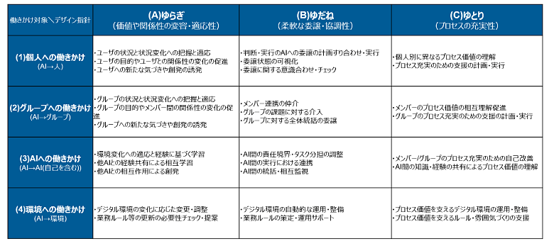 人とAIエージェントからなるグループのよい状態を実現するために、AIエージェントが「ゆらぎ・ゆだね・ゆとり」の3つの観点からどのように働きかけが可能か検討し、結果を表1にまとめました。これは持続的な価値創出に向けたAIエージェントのデザインフレームワークと位置づけられます。横軸はデザイン指針である「ゆらぎ(価値や関係性の変容・適応性)」、「ゆだね(柔軟な委譲・協調性)」、「ゆとり(プロセスの充実性)」を示しており、縦軸はAIエージェントの介入対象である4つの層(個人、グループ、AI自身、環境)を示します。