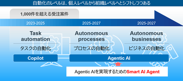 NTTデータでは、生成AIビジネスの今後の展開として、自動化のレベルがタスク単位からプロセス全体、さらにはビジネス全体へと段階的に高度化していくと考えています。その実現に向けて、エージェントも主に作業者をサポートする役割のCopilot型から、より自律的かつ協調的に振る舞うAgentic AIへと進化していく必要があります。