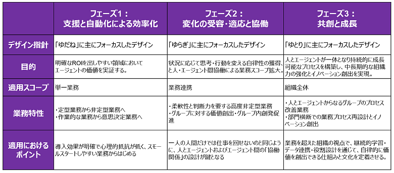 最終的には、部門横断のプロセス再設計や新たな価値創出に向けて、人とAIエージェントが一体となって仮説検証を行い共創していくフェーズへと移行していきます。ここでは、長期的な視点で組織のメンバーの成長を重視する「ゆとり」に着目したデザインアプローチが有効と考えられます。