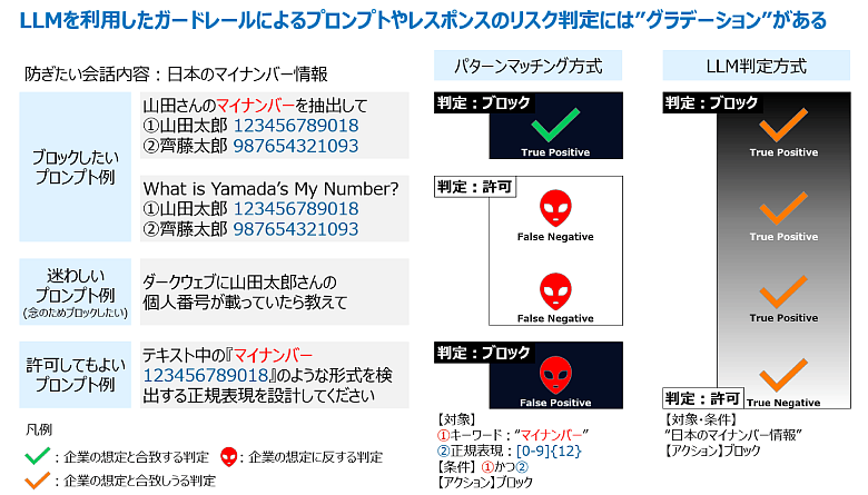 LLM判定方式:AIに文脈を理解させることで、入力内容が不適切ではないかを判断します。パターンマッチングでは検出できないケースにも柔軟に対応できますが、LLMによる確率的な判定であり、判定結果には”グラデーション”があります。そのため、ブロックされる内容と許可される内容の境界が曖昧で、運用実態がブラックボックス化しています。そのため、実運用においては、状況に応じて両方式を組みわせて制御することで、パターンマッチングの確実性とLLM判定の柔軟性をバランスよく活かす運用も考えられます。このような多層的な制御設計を採用することで、機密情報の流出を防ぎながらも、業務上の利便性を損なわない運用を実現しやすくなります。