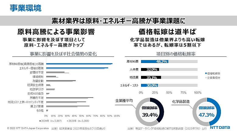 「素材業界は、川上と川下の需要差の間に位置しており、供給制約や市況の変動を受けやすい構造になっている。まさに調整弁のような役割を担っている業界である」と、登壇したNTTデータの宮原は語る。