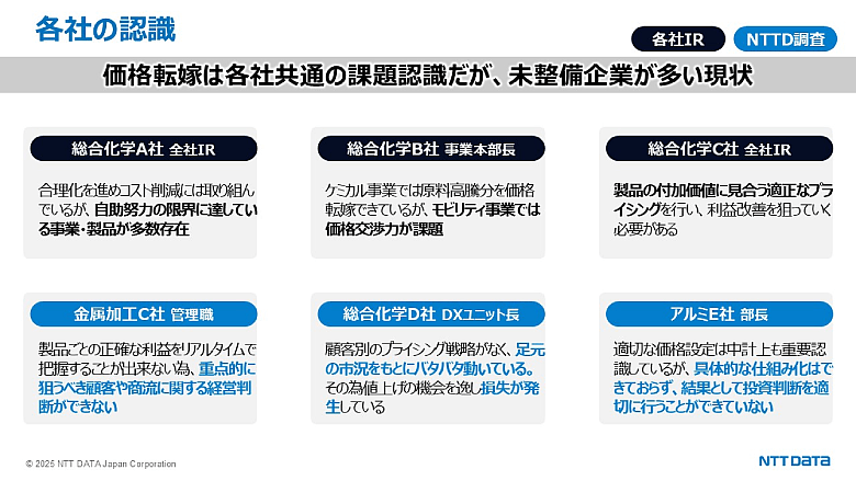 実際、NTTデータが収集したIR情報や企業ヒアリングでは、複数の共通課題が浮かび上がっている。たとえば、製品別の利益が把握できておらず、どのSKUが収益を押し下げているのかが見えない。結果として、値上げの判断が曖昧になり、現場では「どこから手をつけるべきか分からない」といった声が上がっている。