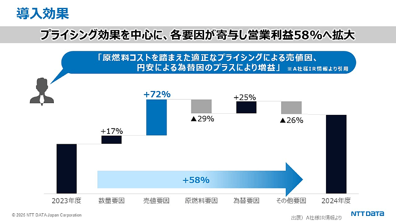 ERPとの連携により、予定売価や受注情報をもとに利益試算や価格シミュレーションが可能となり、販売実績データを活用し、値上げによる販売数量の減少や在庫変動も予測できるようになったという。導入後、営業利益は前年同期比で58%増加した。IR情報によれば、売値要因の72%が価格戦略によるものであり、価格設定の精度向上が業績改善に大きく寄与した。