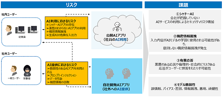 NTT DATAでは、社員がAIサービスを利用する際や、組織や会社が外部にAIサービスを提供する際に、主に以下のリスクと課題が存在すると考えます。
