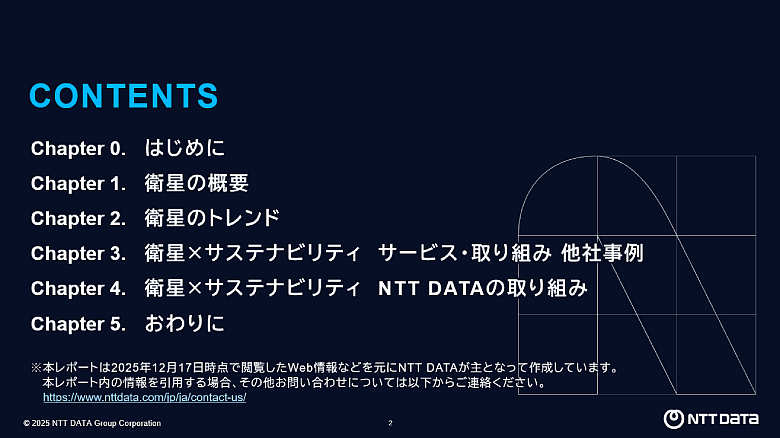 NTT DATAではこうした課題にも配慮しつつ、衛星技術を進化させ、新たな価値創出とより持続可能な社会の発展に貢献していきます。