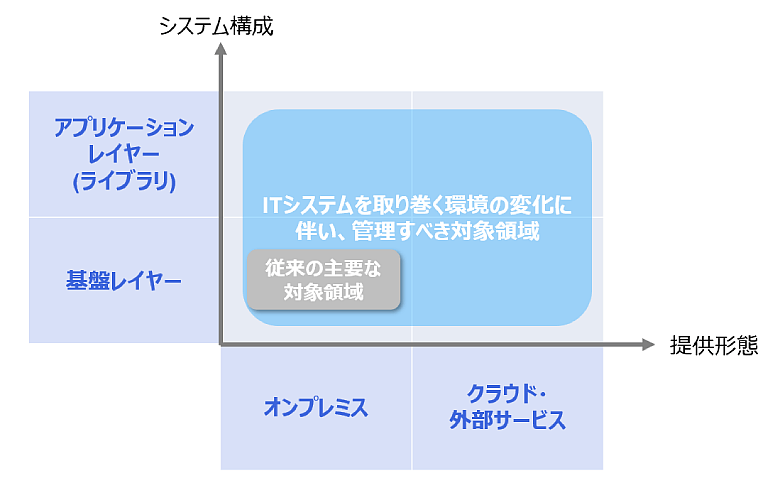 近年、ITシステムを取り巻く環境の変化に伴い、管理すべき対象領域そのものが広がっています。