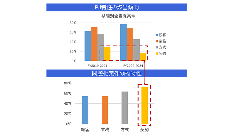 2022年度以降のデータを分析すると、契約面のプロジェクト特性(以下、PJ特性)(※2)に該当する案件で、問題化する傾向が顕著でした。