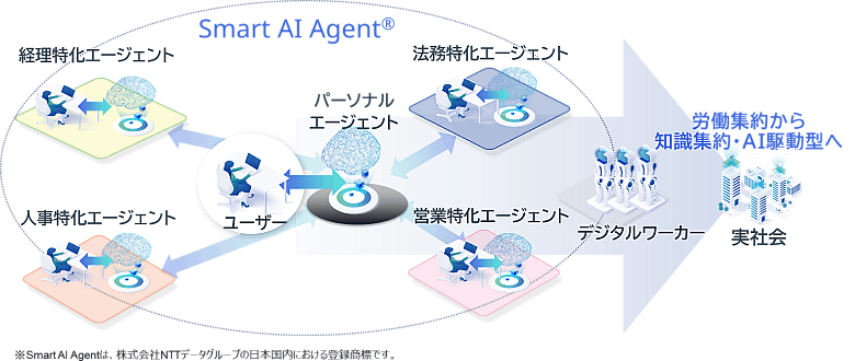 NTTデータでは、生成AI活用コンセプトとして「Smart AI Agent」を掲げています。オフィスワーカー個人の業務に最適化された「パーソナルエージェント」、専門性の高い業務を担う「特化エージェント」など、それぞれのAIエージェントが連携し、多様なテクノロジーを組み合わせることで、業務プロセス全体を自律的に実行することができるようになります。