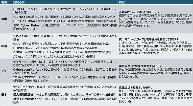 各国・各地域のサイバーセキュリティ規制は、それぞれの統治構造や文化的背景を反映して設計されるため、表1のような違いは今後も並存すると考えられます。企業にとって重要なのは、特定の規制に個別対応することではなく、異なる規制思想を前提にインシデントを未然に防ぎ、万が一発生した場合に迅速に対応できる能力を備えることです。セキュリティ対応は、もはやコストではなく、市場に参加し続けるための条件になりつつあります。