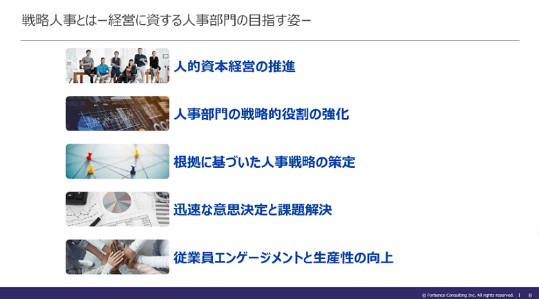 事業環境の高度化、複雑化が進む中、日本企業には「人手不足と人あまりの同時進行」「デジタル加速と新技術への対応」「価値観の多様化」など、従来の枠組みでは対応しきれない組織・人事の課題が増えています。そこで不可欠となるのが戦略的人材マネジメント、いわゆる「戦略人事」です。採用・労務・給与などの管理業務が中心だった人事部門は、経営戦略と人事戦略を連携させ、現場に浸透させていく役割への進化が求められています。