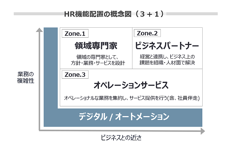 HRには、3+1の機能があると私たちは考えています。1つ目(Zone1)は、人事の「専門家」としての機能。人事企画や労務・法務といったコーポレートの視点を持ちながら、人事戦略や施策の方針策定、改善案、業務、サービスを設計します。2つ目(Zone2)は、「ビジネスパートナー」の機能。事業戦略やバリューチェーンを理解した上で、経営層と連携してビジネス上の課題を組織・人材の面で解決します。3つ目(Zone3)は、「オペレーションサービス」。オペレーショナルな業務を集約し、HRサービスを提供します。そして、近年重要性を増しているのが、+1の機能。「デジタル/オートメーション」です。エージェント型AIの導入といったデジタル活用を進めて、データに基づき人事施策や組織の課題解決を行っていくとともに、「専門家」「ビジネスパートナー」「オペレーションサービス」といった各機能における意思決定の精度を高めます。