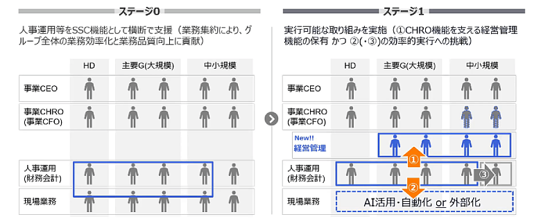 HRの高度化に取り組むA社の事例をご紹介します。インフラ系グループで、間接業務のシェアードサービスセンター(SSC)を担うA社は、グループの長期的な構想の下、将来的にはグループ会社のCXOといったホールディングが従前担った機能へ領域を拡張することが求められました。ホールディング機能への拡張を一足飛びに実施するのではなく、まずはその手前で経営管理を担うビジネスパートナー部門を立ち上げ(ステージ1)、グループ内の主要企業・中小企業の経営管理を担っています。