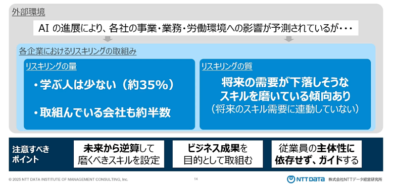 日本企業においてリスキリングに取り組む従業員の割合が3割にとどまる背景には、業務プロセスへのAI実装の遅れや、AIによる今後の要求スキル変化への認識の不足があります。また、リスキリングに取り組む多くの人が、今後需要が低下するスキルを磨いてしまっているという調査データもあります。リスキリングを個人の自主性に委ねてしまっている現状を変えていく必要があるでしょう。