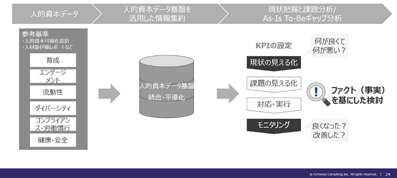 これら課題を乗り越え、戦略人事へと移行する第一歩となるのが、「KPI設定」と「人的資本データ基盤の整備」です。