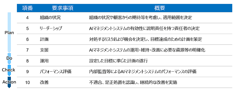 この規格は、品質(ISO 9001)やセキュリティ(ISO/IEC 27001)と同様に、PDCAサイクルにもとづいたマネジメントシステムの構造を持っています(図1)。組織内でAIMSを確立する際には、AIシステムにおける自組織の役割を明確にし、AIポリシーの策定のほか、AIリスクのアセスメントと適切なリスク対応を実行することが求められます。
