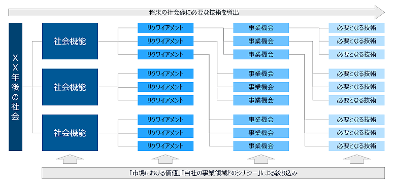 技術を競争優位の源泉として企業価値を高めるには、研究開発の成果を効率的かつ持続的に事業につなげる必要があります。そのためには、将来の社会像に必要な技術を導出する視点が欠かせません。本稿では、「社会機能の整理」「各機能におけるリクワイアメントの把握」「事業機会仮説の導出」「将来必要となる技術の予測」の順に社会課題を解決する技術の導出を行います。将来予測では不確実性が高くなるため、技術の活用シーンを想像するのは容易ではありません。そのため、社会に求められる機能を俯瞰することから始め、次に自社と関連のある事業領域、技術領域へと検討対象を絞り込みながら、特定の領域において将来必要な技術を導出することが適切です。各段階では、市場における価値、自社の事業領域とのシナジーの観点で評価しながら、優先度を決めていくことができます(図4)。