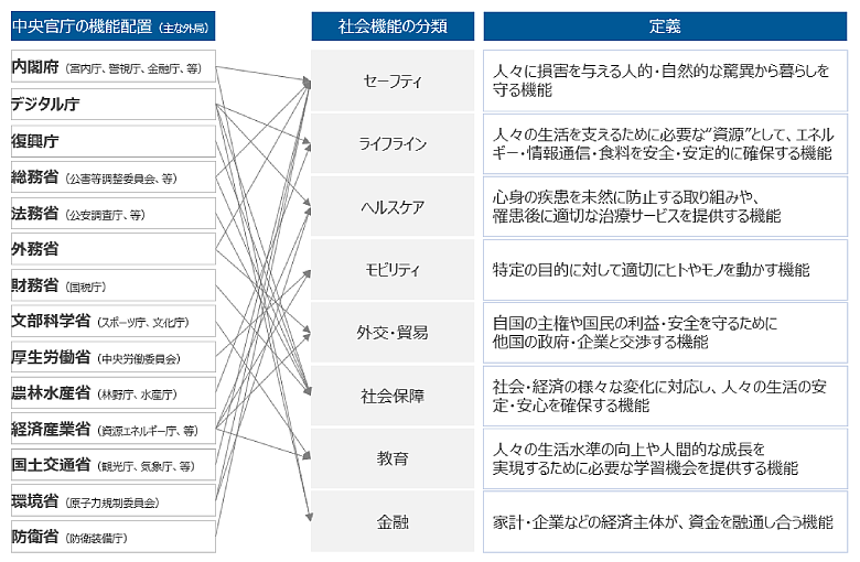 まず、将来の社会で求められる「社会機能」を導出します。ここでの「社会機能」とは社会システムを維持するために必要不可欠な機能のことです。例えば、国家運営を担う中央省庁の構成・配置を起点として社会機能を整理することができます(図5)。
