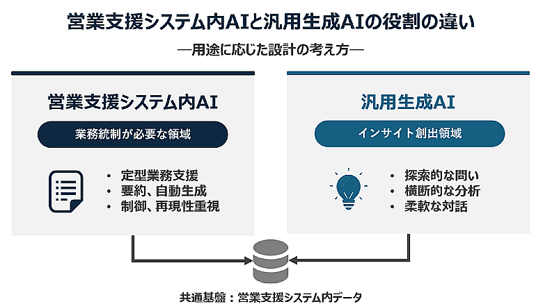 生成AI活用の本質は、エージェント機能の高度化そのものではありません。営業という不確実性の高い業務領域において、生成AIにどの程度の自由度を与え、どこで制御するのか。その設計思想こそが、今後の営業支援システムの価値を左右すると言えます。