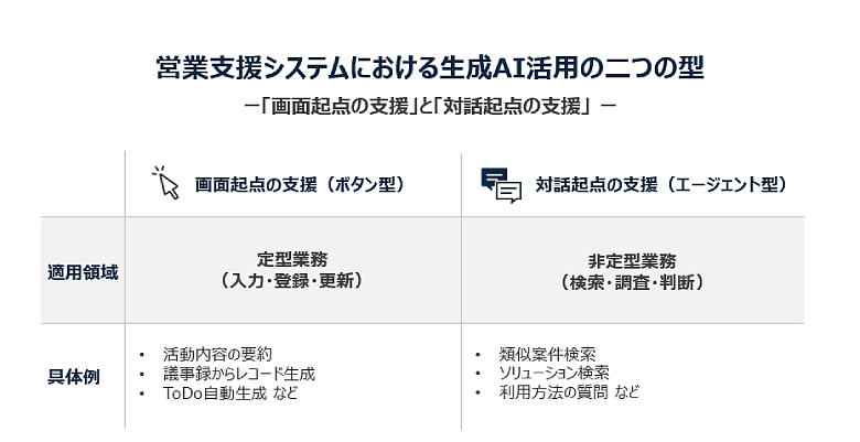 こうして洗い出したユースケースを、効果、実装の現実性、全社展開との親和性といった観点で評価し、最終的に二つの活用パターンに整理しました。一つは、『画面起点の支援(ボタン型)』です。画面操作を起点に、要約や自動生成などを行う支援として、取引先や商談画面から会議の議事録を入力し、その内容に基づいて関連レコードやToDo活動を自動作成する機能や、活動状況を要約する機能などを検討しました。
