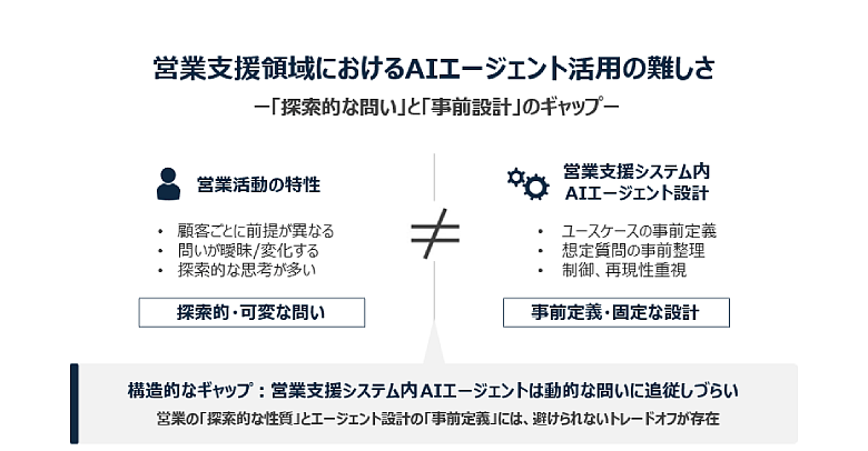 一方で、営業支援領域においてエージェント活用を検討する中で、業務特性に起因する課題が見えてきました。営業活動では、顧客や案件ごとに状況が異なり、問いの前提や意図も揺らぎやすくなります。そのため、エージェントを設計するにはユースケースや想定される質問を事前に定義する必要がありますが、すべての問いをあらかじめ定義することは現実的ではありません。その結果、想定外の問いに対して柔軟に対応することが難しい側面があります。