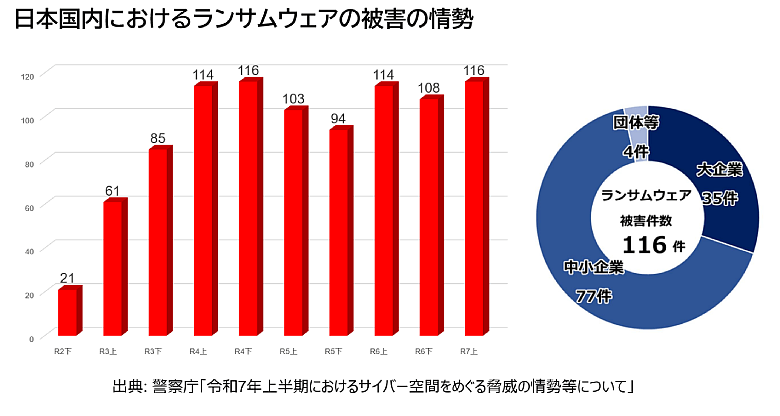 日本国内に目を向けても状況は変わりません。警察庁の統計によると、ランサムウェアの被害届出件数は、ここ3~4年にわたり年間200件前後で推移しています。2025年度上半期だけで116件が報告されており、被害のペースに減速の兆しは見えません。