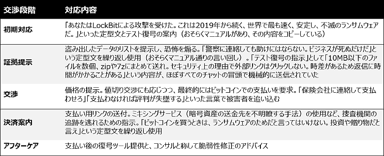 「交渉には段階があり、初期対応から証拠提示、価格交渉、決済案内、さらにはアフターケアまでマニュアル化されています。定型文を繰り返し使い、被害者を追い込んでいく。まさに“業務”として攻撃が行われている。一方で、被害者を無視したり、壊れた復号ツールを渡したりするなど、極めてずさんな実態も明らかになりました。身代金を支払っても、攻撃者が約束を守る保証はどこにもありません」(新井)