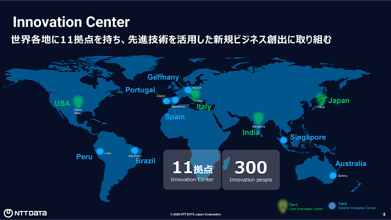 NTT DATAは2022年、先進技術を活用した新規ビジネス創出に取り組む「イノベーションセンタ」を設立した。現在では世界11拠点、約300名の体制で、技術の研究開発だけでなく、顧客との共創によるユースケース開拓とビジネス成果の創出に取り組んでいる。