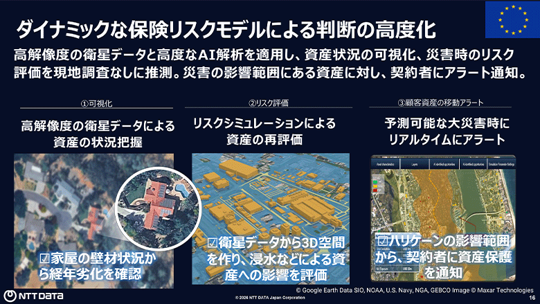 古川が紹介したのは、欧州の大手損害保険企業との共創事例だ。従来の保険ビジネスでは、加入時の審査でリスクを評価するが、気候変動や都市開発により、そのリスクは経年変化していく。