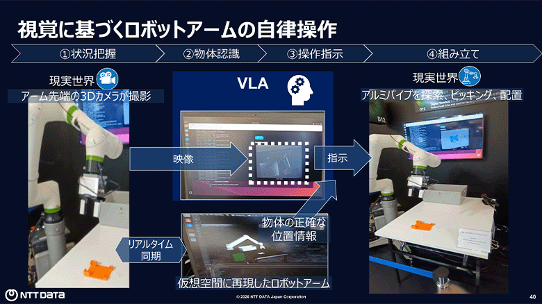 NTT DATAでは、ロボットアームと3Dカメラを組み合わせ、VLAを用いたピッキング作業の実証を行っている。また、梱包(パッキング)ロボットメーカーと協業し、NTT DATAの自律走行機能を搭載した次世代ロボットを2026年5月にローンチする予定だという。
