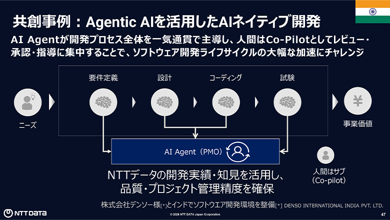 「例えば株式会社デンソー様との共創事例では、インドでソフトウェア開発のPMO(プロジェクトマネジメントオフィス)業務に『Agentic AI(自律型AIエージェント)』を導入しました。進捗管理や品質チェックをAIが主導し、人間はAIの提案を承認・指導する『Co-Pilot(副操縦士)』の役割に専念する。これにより、開発ライフサイクルの大幅な加速に挑戦しています」