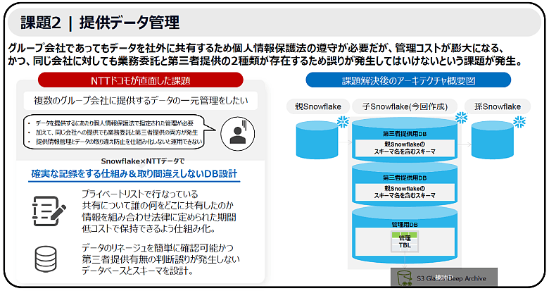 また、NTTドコモ特有の事情として、同一のグループ会社に対して「ドコモからの業務委託」として提供するデータと、「その会社独自の事業」のために提供する第三者提供データが混在しているという複雑さがありました。これらを同一の領域で管理すれば、取り違えによる法違反のリスクが生じます。