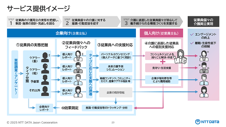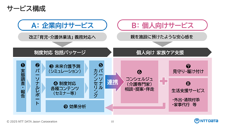 ケアラケア事業は、「企業向けサービス」と「個人向けサービス」の2つの柱で構成される。2025年4月から段階的に施行された改正育児・介護休業法により、企業は従業員の介護実態を把握し、支援する義務が強化された。しかし多くの企業は、具体的にどう対応すればよいのか手探りの状態だ。