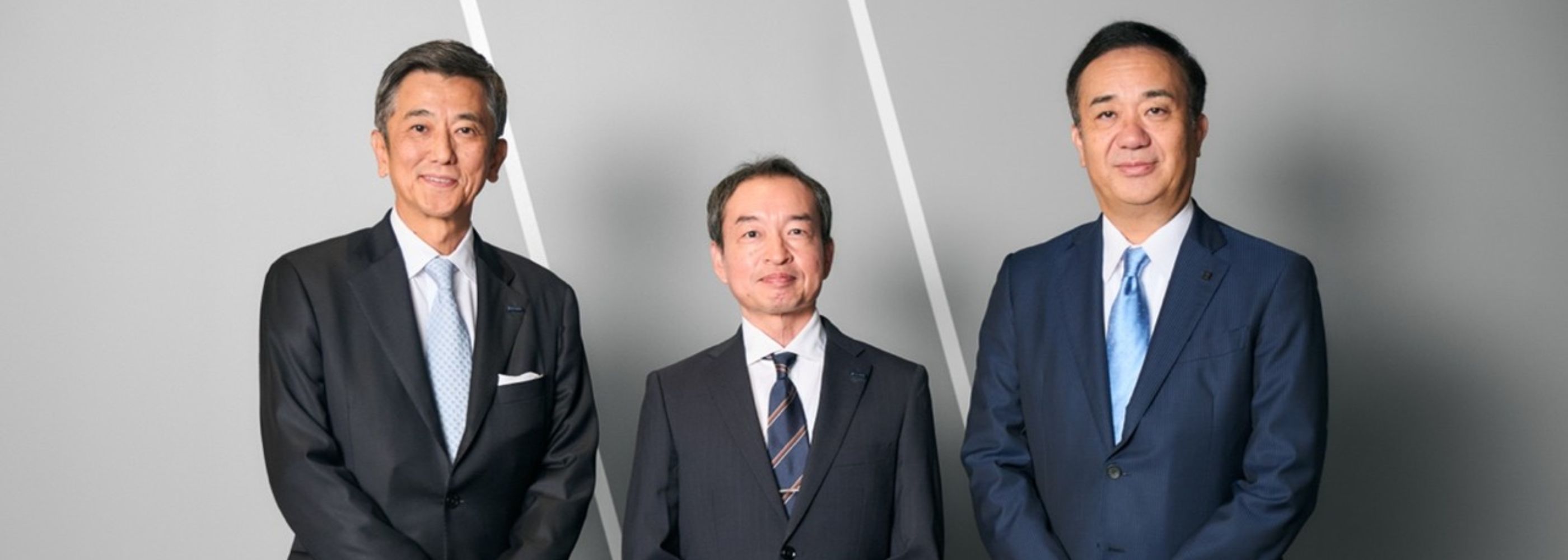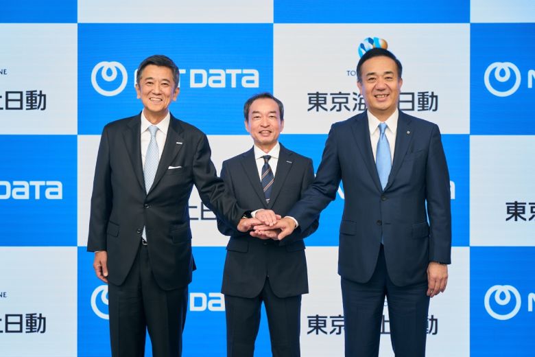 左から、NTTデータ代表取締役社長 鈴木 正範、NTTデータ ライフデザイン代表取締役社長 濱口 雅史、東京海上日動火災保険代表取締役社長 城田 宏明 氏