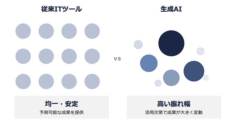 その理由は、生成AIが従来のITツールと異なる性質を持っているからだ。従来のITツールは、配布すれば一定の効果が均等に広がることが多かった。しかし生成AIは違う。同じツールを渡しても成果が均一にならず、使い方の差がそのまま成果の差として露出しやすい性質を持っている。だからこそ、最初に問うべきは「どうすれば全員が使うか」ではなく、「誰の、どの成功を、どう再現するか」だ。