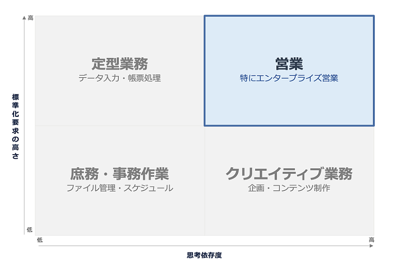 営業は標準化が追い求められる職種だ。商談プロセス、提案フォーマット、ヒアリング項目等、属人性を減らし再現性を上げることが、組織としての正義になりやすい。しかし、「手順の標準化」だけではなく、論点を切り出す力、仮説を立てる力といった「思考の力」も重要だ。そのため営業領域では、生成AIは資料作成や要約の“作業代替”と同時に、論点整理や提案構造化といった“思考補助”として効いてくると考えている。