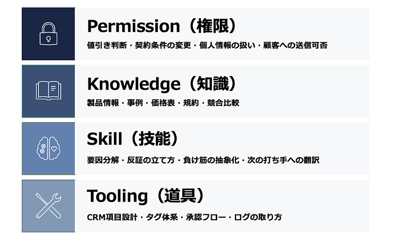 役割(誰がこの業務を担うか):この業務は誰でも機能するわけではない。商材・業界の勘所を言語化できる、反証を立てられるなどの条件を満たすシニア営業や営業マネージャーを起点に設計して初めて、「誰の成功を再現するか」が具体化する。