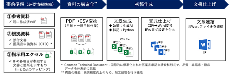 (2)『資料の構造化』は、承認申請資料・電子化された添付文書・過去に作成済みのIF(参考用)をCSV形式に変換する作業だ。その後、(3)『初稿作成』へと移る。ここでは、生成AIを活用して文書を執筆し、執筆した文章を指示用Excelに準じてIFの適切な場所へと転記する。
