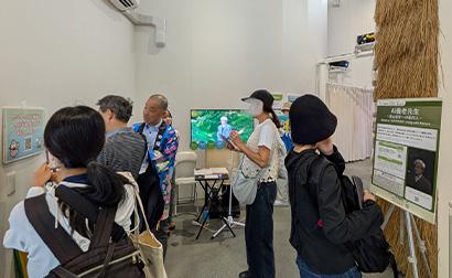 ブース内では、イマーシブ動画「SATOYAMA」(福島の里山映像)、AI養老先生との対話体験、そしてポスター展示を通じて、「拡張地域社会」の世界観を発信しました。