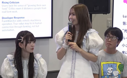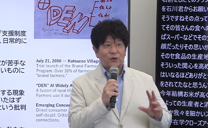 高際均特任教授の進行のもと、「生産者と消費者をどうつなぐか」というテーマで多彩なアイデアが未来のニュース形式で披露され、活発な議論が繰り広げられました。