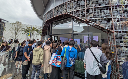 イマーシブ動画「SATOYAMA」では、田村市・葛尾村・浪江町・喜多方市の協力のもと、豊かな自然や地域産業、人々の暮らしを描写。万博のシンボルである大屋根リングの製造工程をトロッコ列車でさかのぼる構成で、木の香りが漂う空間とともに来場者を包み込みました。
