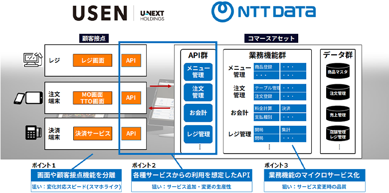 NTTデータのPOSソリューション(コマースアセット)は、様々なお支払いデバイスから利用できる柔軟な仕組みを備えている点が特徴です。そのマイクロサービスアーキテクチャ(小さなサービスの集合体で構成されている)を採用しており、UI・他サービスからAPIを経由して各種業務機能を利用することができます。